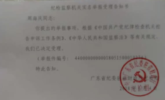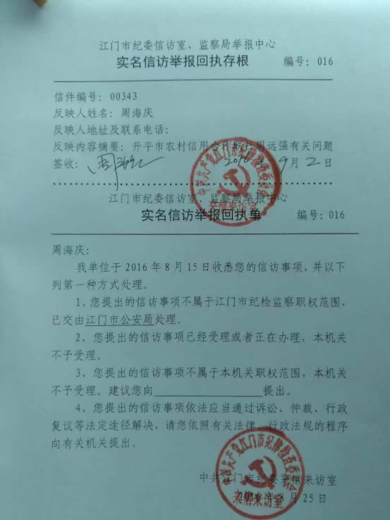 我周海庆实名举报原开平农信社主任周某,利用职务之便诈骗钱财。我于2015年10月13日前往开平市公安局经侦大队,向江门市、开平市纪委和检察院反映情况。2016年8月19日向开平市公安局经侦大队报案和提交周某诈骗犯罪的证据。但在2016年9月10日,我却收到了开平市公安局开公(经)不立字《2016》07号的不予立案通知书,我觉得事情蹊跷,为什么事情的真相就是按周某的意思把涉案的钱财给到了他指定的银行帐号,而且我在周某办公室的谈话录音证据也证明周某明确要归还周海庆839万多元,为何对有明确证据的案件,相关单位却不立案调查。