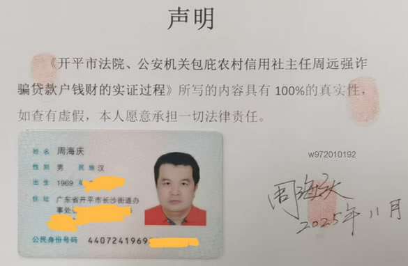 开平市农信社主任周某,一条高压反腐下的漏网之鱼。一个县级市的银行干部刚退下来便能敛财数十亿以上,一直以来周某利用他实际控制的高利贷公司担保,伙同现开平农信社司徒东辉等个别职员串通,引诱需要向银行正常借款发展的贷款客户借款,以不当理由欺骗贷款客户收取高额手续费用,利用贷款期间提高贷款利息或提前要求结清等不法手段,强逼贷款客户低价处理个人资产,周某就利用官商勾结诈骗超低价把客户抵押资产收购据为己有。他的行为严重扰乱金融秩序,危害国家金融安全。是不折不扣的硕鼠!