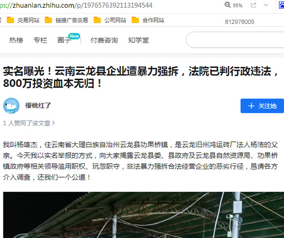 我叫杨雄杰,住云南省大理白族自治州云龙县功果桥镇,是云龙旧州鸿运砖厂法人杨浩的父亲。今天我以实名举报的方式,向大家揭露云龙县委、县政府及云龙县自然资源局、功果桥镇政府等相关领导滥用职权、玩忽职守,非法暴力强拆合法经营企业的恶劣行径,恳请各方介入调查,还我们一个公道!