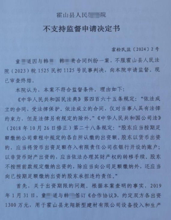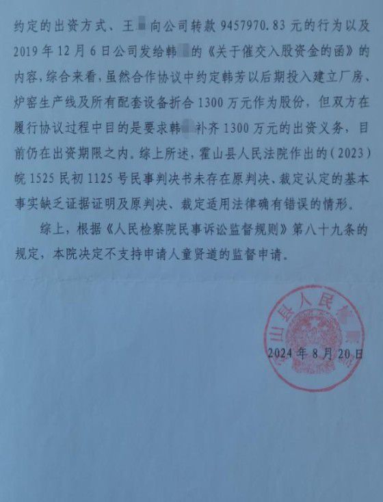 绝望之际,童先生向安徽省霍山县相关单位申请民事监督,寄望通过这一途径纠正司法偏差,还原案件真相。他坚信,韩芳一方虚构出资的行为并非无凭无据,而是有据可查;股东大会决议、设备采购相关证据链完整,足以佐证其自身诉求合法合理,同时他认为,现有司法判决并未对案件相关事实开展充分核查,事实认定不清。