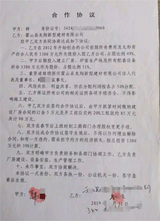 时间回溯至2012年,童先生经安徽省霍山县相关部门招商引资,创办了龙翔新型建材有限公司,前期投入大量土地、设备等资产,为企业奠基。2019年1月,经人介绍与韩某、李某海夫妇达成合作,双方签订《合作协议》,约定童先生以现有资产折价1300万元出资,持股49%;韩某出资1300万元用于后续厂房、窑炉生产线建设,持股51%。协议签订后,双方均知晓并认可股份代持安排——韩某的股份先后由王某、韩某贵代持,童先生的股份则由宋某翠代持。