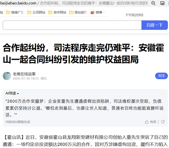 【霍山讯】近日,安徽省霍山县龙翔新型建材有限公司创始人童先生哭诉了自己的遭遇:一场约定总投资额达2600万元的合作,因对方涉嫌虚构出资、履约不力陷入停滞,企业长期停摆负债累累;而他历经多重司法程序,不仅未能维护自身权益,还因经济困窘错失上诉机会,陷入山穷水尽的境地。