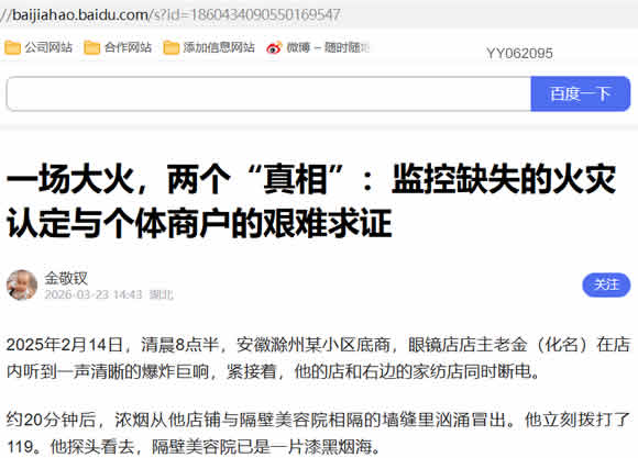1“不完整”的监控录像。 老金一方指出,隔壁美容院拥有两个监控摄像头,但在火灾最关键的时间段(8:30-9:30),其存储的录像存在大量、不连贯的删减。他们多次向消防部门及复核机关申请调阅、查看完整的监控录像(包括店内及周边治安监控),均被拒绝。关键证据的缺失,为事实蒙上了第一层阴影。