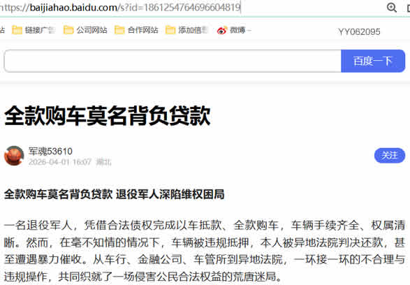 一名退役军人,凭借合法债权完成以车抵款、全款购车,车辆手续齐全、权属清晰。然而,在毫不知情的情况下,车辆被违规抵押,本人被异地法院判决还款,甚至遭遇暴力催收。从车行、金融公司、车管所到异地法院,一环接一环的不合理与违规操作,共同织就了一场侵害公民合法权益的荒唐迷局。