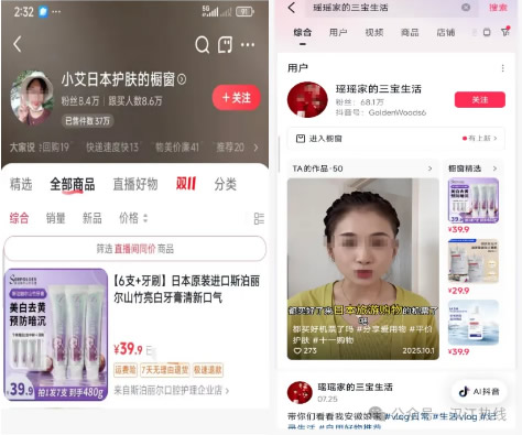 据消费者反映,这款 “日本原装进口” 的斯泊丽尔山竹牙膏尤其以分享海外生活的主播“小艾日本护肤”(抖音号粉丝8.4万)和“瑶瑶家的三宝生活”(抖音号粉丝 68.1 万)影响最大。 她们 IP 归属地都是日本,视频里常分享在日本的日常生活,还说 “一家三口暂居日本十余载”,以此诱导消费者确信她们推荐的 “日本货” 靠谱。