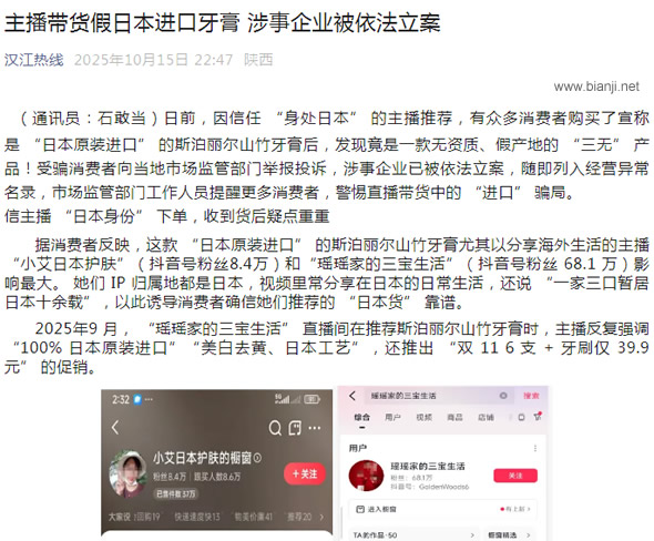 (通讯员:石敢当)日前,因信任 “身处日本” 的主播推荐,有众多消费者购买了宣称是 “日本原装进口” 的斯泊丽尔山竹牙膏后,发现竟是一款无资质、假产地的 “三无” 产品!受骗消费者向当地市场监管部门举报投诉,涉事企业已被依法立案,随即列入经营异常名录,市场监管部门工作人员提醒更多消费者,警惕直播带货中的 “进口” 骗局。信主播 “日本身份” 下单,收到货后疑点重重