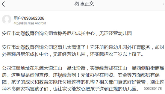 希望安丘市教育体育局严查这种以教育咨询公司名义无证经营幼儿园业务的行为。